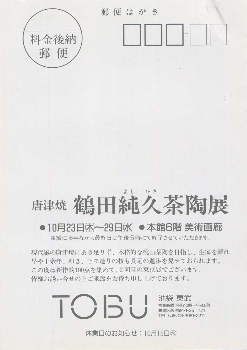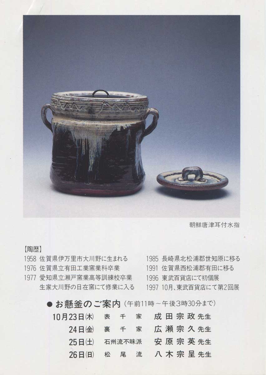 現代風の唐津にあき足りず、本格的な桃山茶陶を目指し、 生家を離れ早十余年、 叩き、紐作りの技も長足の進歩を見せておられます。 この度は新作約100点を集めて、2回目の東京展でございます。 皆様お誘い合わせの上ご来廊をお待ち申し上げます。