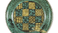 The design of a peony with two flowers and a fierce eagle in the center are drawn in strong lines over the entire prospective area, and the ground is filled with a small pattern of plum blossoms. The ground is filled with a small pattern of plum blossoms. It is colored in purple, green, and yellow, but the purple glaze surface is somewhat rough. The reverse side is decorated with wavy swirl patterns and lightly glazed with green. This kind of composition is rare among Aote Kogutani wares.