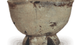 This tea bowl is also in the shape of a shoe. The roundness of the hips, the construction of the base, and the prospective shape, as well as the black glaze applied to the entire surface, are truly Koetsu’s. The glaze is applied in the style of curtain glaze, and the white lines are drawn around the break in the glaze. It is interesting to see the serpentine glaze appearing as if it were a white line around the break in the glaze, which was applied in the style of a curtain glaze. Although it is not clear, there are about five marks on the tatami mats of the stand, and the inside of the stand has been cut away in the shape of a Tomoe. On the cover of the inner box, Kakusai Haraso wrote “Koetsu black tea bowl, branded Rakuten Left (Hanasho)”. Many of Koetsu’s tea bowls have the calligraphy of Haraso.
