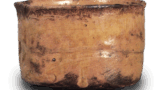 This is a semi-tubular tea bowl with a slightly tightened body and a vertical waist. The seemingly random arrangement of the tsuke-takadai (high base) has a shiitake mushroom-like appearance when the rim is picked with the fingers, and the fine clay skin is well burnished and tightened. The body is decorated with a tortoiseshell design and a bridge-like design, which are rare for Shino. The white glaze that extends to the waist has melted well, and a reddish hue appears at the hem and mouth rim. There are three finger marks on the rim and two sticking marks on the mouth. There are two sticking marks on the mouth and an “O” mark engraved on the base. There is a large, deep, circular tea reservoir in the outlook. On the front of the lid of the inner box, there is an inscription “Furisode”.