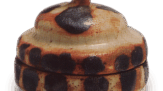 This chunky, heavy-mochi-shaped incense container has a raised, flattened center on the front of the lid, and a low, small ring-shaped base. The white glaze over the entire surface, except for the joint between the body and lid, is well melted, and the red charring around the bottom is vivid. The white glaze is melted well and the red charring around the bottom is brilliant. Both are estimated to have been made in the Muta-dong or Naka kilns in Oyase.