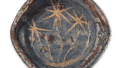 This flat, circular mukozuke has a warped mouth rim with suriza on the outer three sides and square legs on the three sides of the flat bottom. The front is decorated with a stylized “sakura” (a Japanese warrior’s crest) in white, and the inside is decorated with a rim design. The two pieces shown here are similar to the ten other mukozuke we have seen, but only two of them have a tree design resembling an arrowhead painted in iron pigments on top of the outer surface of the oni-ita (panel). The rat-colored glaze tends to be a little bluish, but the reddish underside is vivid.