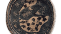 The sharply folded back shape of the mouth is typical of this type of flat bowl, and the four sides of the bowl are picked out to create a seemingly floral shape. This bowl also seems to have been made by applying oniita (devil’s plate) makeup, and the design is composed by making use of the white ground that was left over. In other words, the white ground left over is regarded as a rock, and a tree with a fine leaf tip is shown in white, and three geese are arranged in the sky. One side of the rim is decorated with a rat pattern, while the other side is decorated with a straw pattern and dotted spots. The bottom has legs on all four sides, and there are five small marks on the base. The glaze is smooth and well melted.