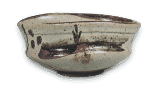 This is a semi-tubular tea bowl with a distorted body as if it were a kutsu chawan, and the outer three sides are decorated with three-tiered horizontal lines. On the bottom of the body, a lotus petal design, which is rare for Shino teacups, is painted, and a reddish color appears on the edge of the mouth through the thick glaze. Both the shape and the design are rare for Shino tea bowls.