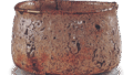 This is a tea bowl with a large oniita (devil’s board) on one half of the bowl, which was made in the Nezumi-Shino style, and a white part is painted with a weave pattern and a pattern like noshi. The body is distorted and slightly shoe-shaped, and the middle of the bulging body is wrapped with a “hime” (a knot) in the style of “dojime” (a tightening knot on the body). The clay surface is slightly hard.