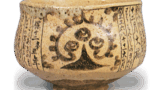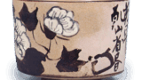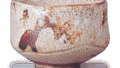 The shape of this vessel, with the mouth rim strongly twisted outward and the waist raised, is a variation of the Tenmoku style. The outer surface is decorated with a mountain range and trees, and the inner surface is decorated with several strokes of a flying cloud-like horizontal stripe pattern. The base is solid and circular, opening outward to reveal slightly hardened Hyakuso clay. There is another tea bowl exactly the same workmanship as this one, with a beautiful reddish color, but it is a rare Shino tea bowl.