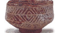 This is a tea bowl with a high waist height, which is often seen in the Nezumi-Shino style. One side of the body is decorated with a gentle mountain design, a weeping pattern, and a cypress fence design. From its shape, it is thought to be a work from the same period as the “Sazanami” and “Higaki-style Tea Bowl” of the Nezumi-Shino ware. The slightly outward opening of the takadai tatami-zuke has been carved with thin lines to form a double takadai, but it has been stroked with the fingers to give it a hand-kneaded taste. The triangular shape of the earthenware is glazed with a relatively narrow area of clay.
