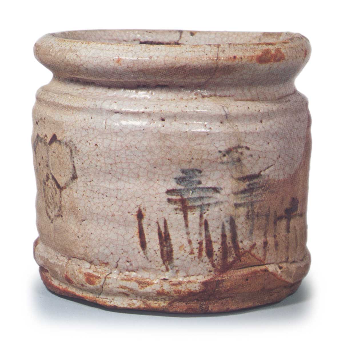 Shino water jar with notchi-shaped mouth, with landscape and tortoise-shell design