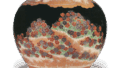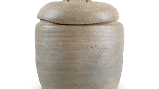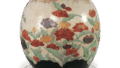 Like the tea jar with Wakamatsu and distant mountains in overglaze enamels, this tea jar is shaped like a shoulder, but its shape is somewhat less uniform.