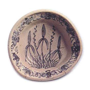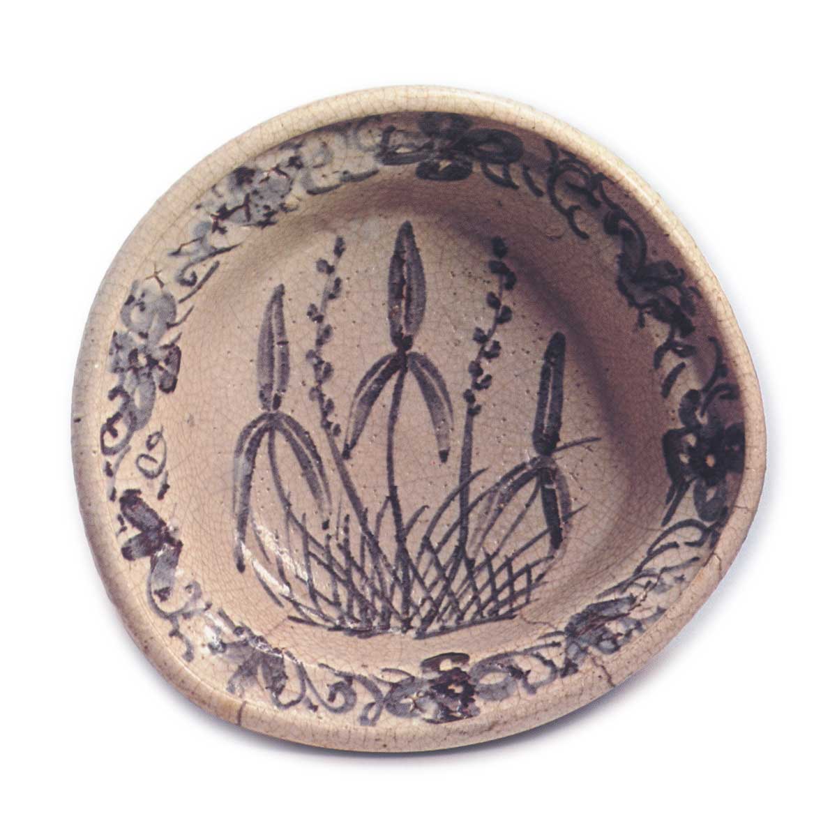 This large Shino pot is stepped at the waist, and the mouth rim is twisted inward to form an irregular triangle. The rim is covered with a smooth, thick white glaze, but there is little reddish color. This type of pot was probably fired in the Ohira or Kusajiri area, and Shino pots of this type generally lack a reddish hue and have a well-melted glazed surface. The bottom of the bowl has the distinctive Mino nail-shaped legs on three sides, and four eye marks remain.