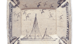 This bowl is decorated with a lotus and floral motif on the front and a bamboo grass arabesque around the rim. This type of pot was probably fired in the Ohira or Motoyashiki area. The coloring of the iron painting is rather light, and the Shino glaze is smooth and thick, with a hint of red around the bottom. There are five small marks on the surface and five round marks between the legs on the bottom.