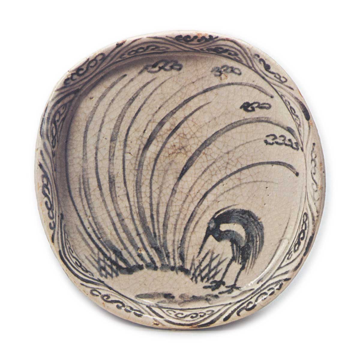This is a bowl distorted into the shape of a fan, with a design of ashes and herons painted over the entire surface and a wave pattern on the rim in an arabesque style, and is of truly elegant workmanship. It has legs on all four sides of the bottom, four small marks on the front and seven marks on the back between the legs. It must have been fired at the former residence.