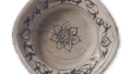 This round, flat bowl has a painting of a man fishing under a tree on the prospective viewer. The front of the bowl is decorated with an elegant design of a fisherman fishing under a tree, and rocks are arranged along a mountain stream. The glaze melts well and lacks a reddish hue, but the glazed surface is softly finished, which is desirable. The bottom has legs on three sides, and there are six small marks on the prospective surface and six large round marks between the legs.