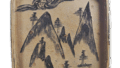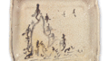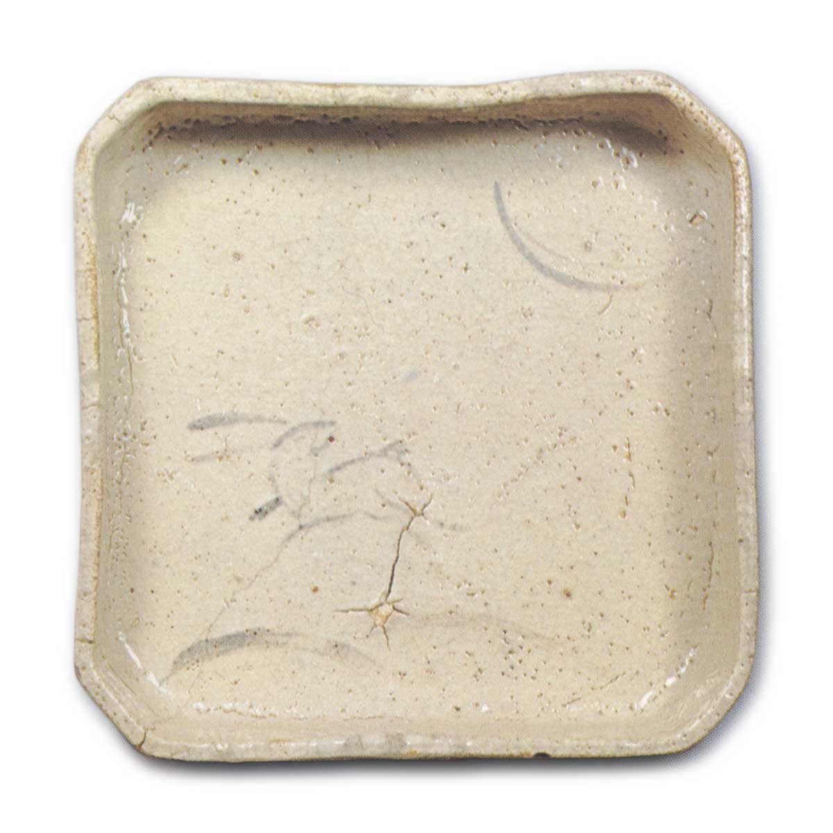 This flat four-sided corner-cut bowl is decorated with the so-called “moon and rabbit” design, but the painting is thin and faintly apparent. The entire surface is covered with white glaze, which is smoothly melted, but the reddish tint is barely visible.