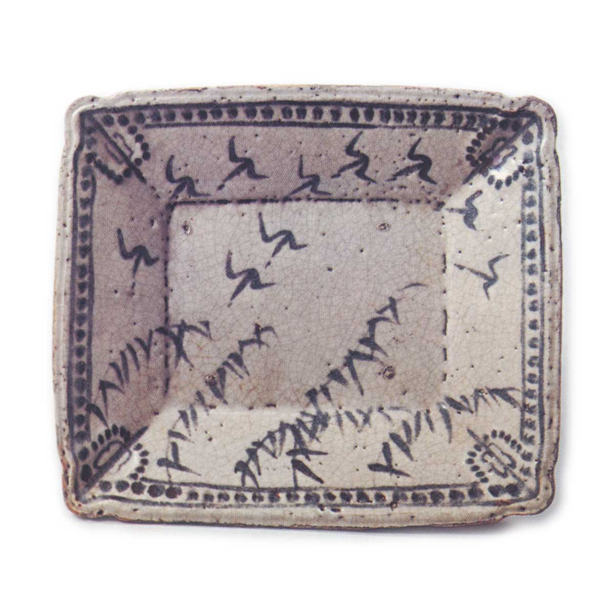 This is exactly the same type of work as the Shino framed plate with an amiboshi design. The prospective subject is a painted pattern resembling an ash tree, and geese are depicted in the sky. The glaze is slightly thicker and the reddish color is almost completely absent. There are four marks on the surface and four legs on all four sides.