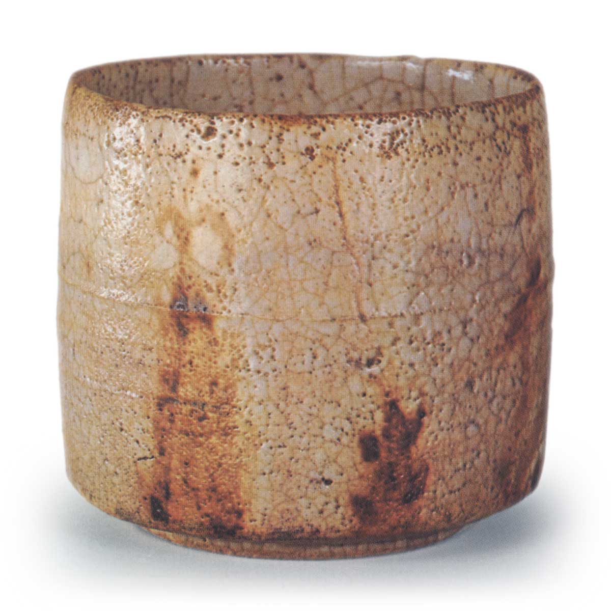 Although now used as a tea bowl, it was probably originally made as a mukozuke. Therefore, its shape is also different from typical tea bowls, as it has a low and wide base. However, even if it is used as a tea bowl, it would be quite tasteful and enjoyable. Two bamboo shoots, one large and one small, are painted on the cylindrical body of the bowl, which is wheel-thrown, and the white glaze over the entire body is well melted. The white glaze over the entire surface is well melted. Moreover, the red charring has been beautifully produced, enhancing the flavor. Toyozo Arakawa was attracted by the beauty of this tea bowl when he first saw it in 1930, and thinking that it might be from a Mino kiln, he walked around the mountains of Mino and collected fragments of the same painting as this mukozuke at the Muta-do old kiln site in Ohgaya. This piece is deeply related to Arakawa’s work, and is also an important piece in the process of discovering that Shino pottery was produced in Mino. On the reverse side of the bamboo shards are drawings of mountains and cypress fences.