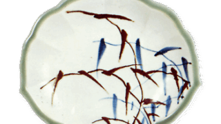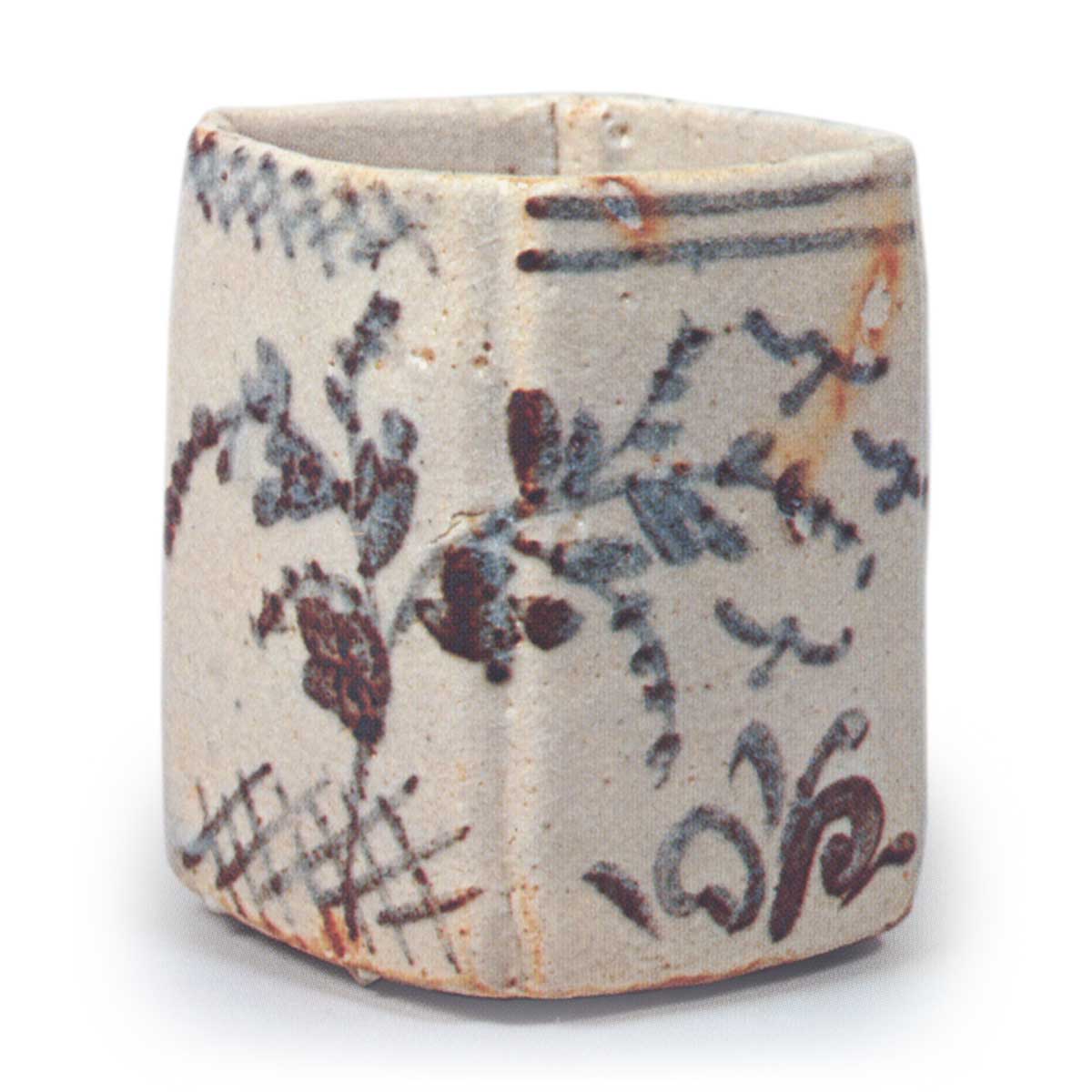 This is a four-way corner mukozuke with a goze bottom. It is used as a hi-iru, but the body is decorated with a design of wildflowers on two sides, and the hem has a hinokagaki pattern and a Warabi-like pattern. The body is decorated with a pattern of wildflowers on two sides, and a hinokaki pattern and a Warabi-like pattern are arranged on the hem. The bottom of the bowl is of the go-zoko type, and the round eye marks are colored red.