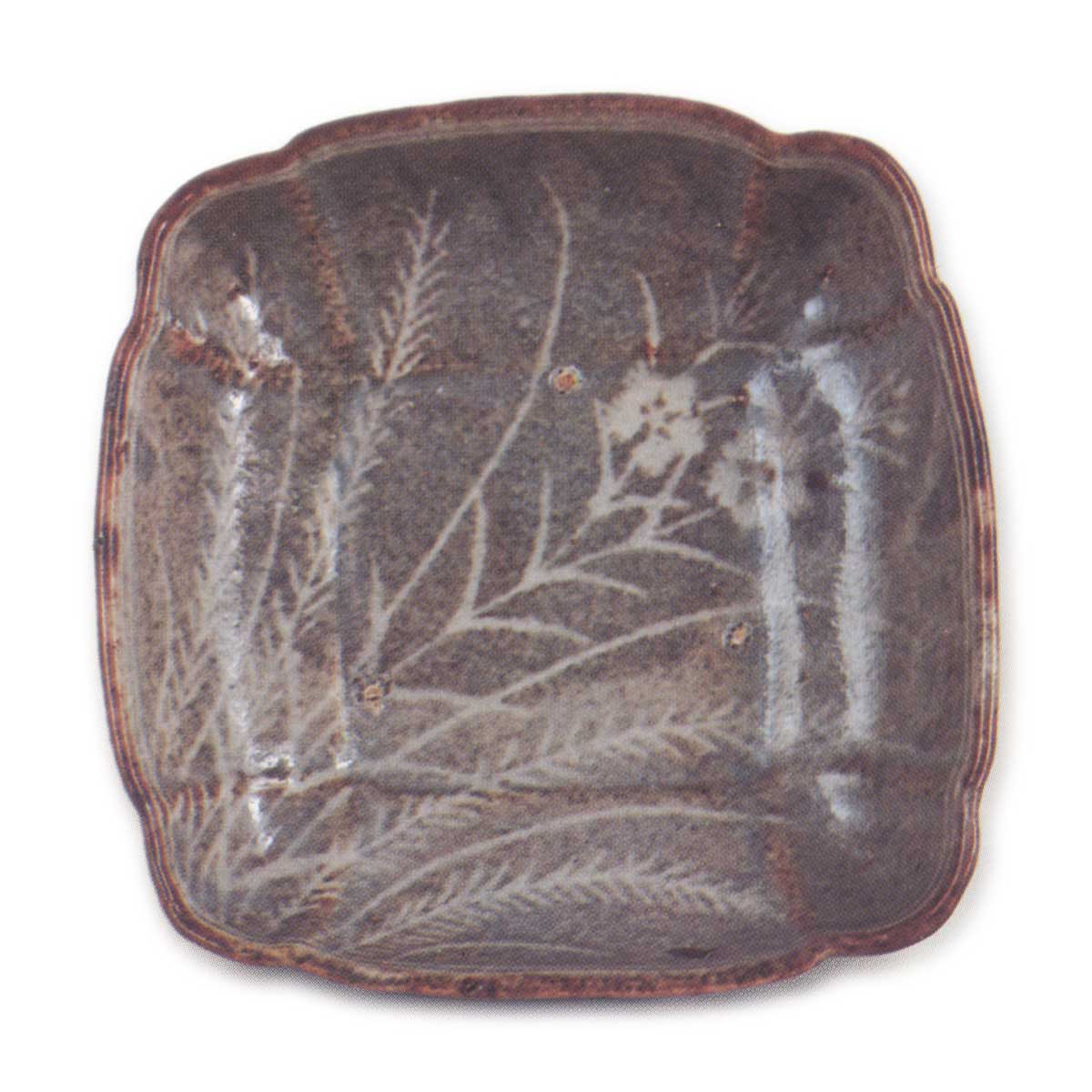 This is a shallow, four-sided, four-way shaped mukozuke with rounded corners, and the trace of a square mold is still visible on the front surface. It is bordered by two thin lines and has a diagonal pattern of “natsuko” (a Japanese name for a woman’s petticoat) on the front and legs on three sides of the bottom.