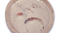 This shallow mukozuke has a low, vertical rim, a rounded bottom, and a flat base. The bottom is rounded and the tatami mat is flat. Two single wheels are placed in the prospect, and an umbrella-like pattern is painted in the center. The white glaze is slightly unevenly applied, and some glaze pooling has occurred, but the mouth rim is reddish and the bottom also has a beautiful reddish color.