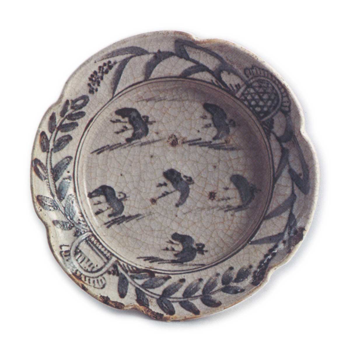This mukozuke has a six-petaled flower-ringed rim at the mouth of the sword-shaped opening. The circularly indented mouth is decorated with a design of waves and plovers, and the rim is decorated with two types of plant patterns stretching to the left and right, centering on a fence. The glaze is hard and well melted, with rough penetrations. There are four large and four small marks on the bottom.
