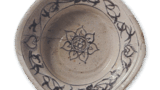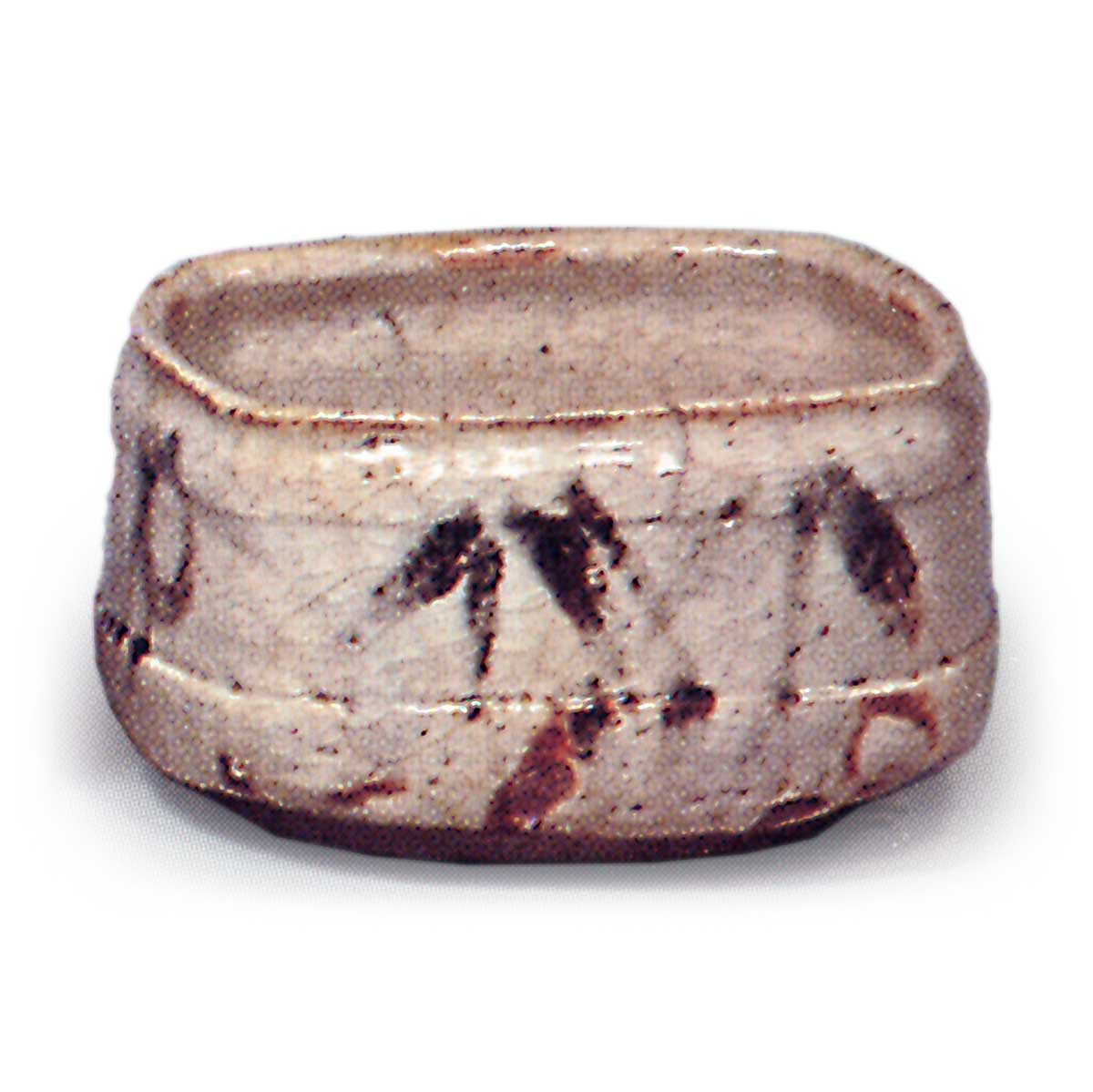 This is almost the same workmanship as the mukozuke with Shino floral motifs, but slightly larger. The body is also decorated with a combination of floral motifs, baskets, mokusa, lotus petals, bamboo, and other motifs. The bottom is made in two types: a goze bottom and a low rimmed base, with the same markings as on the previous piece. The glaze is not very thick, and reddish tints appear everywhere. Figure 261 and this piece were probably fired in the same kiln. There are five pieces in this set.