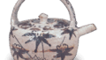 The body is two-tiered, and a spout and handle are attached as in the previous example, but a washer-like decoration is affixed to the base of the handle, and the bottom is a ring-shaped platform.