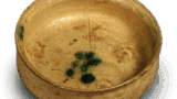 The term “iris-te Kiseto” is said to have been coined for this piece. The iris design, which appears as a single plant in the deep prospect, is so vivid that it made a deep impression on people, and this type of ware came to be called “Shobu-te” even if the design is not of iris. It is a large, flat bowl with a bell-shaped rim shaped like a double-petaled ring flower, and is also commonly called a gong bowl because it resembles a gong at first glance. Along with bowls with daikon (Japanese radish) and flower patterns, this is the largest of the Kiseto series. It is decorated with a single iris plant carved in lines, and the leaves are heavily painted. The rim is decorated with a floral arabesque carved in lines and painted with iron and . The rim is decorated with floral arabesques carved in lines, and the rim is decorated with iron and vitriol. The bottom of the bowl is circular and shallowly carved in the shape of a go-zoko, with burn marks on the glaze. Despite being a large piece, it is thinly molded and surprisingly light to the touch. This is a masterpiece with a strong style among Kizeto wares.