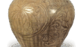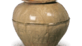 This wide-mouthed jar is in the same lineage as the previously mentioned cinerary urn owned by monk Shinchikai, but it is richly decorated with a floating pattern and protruding bands, which are common in the late Kamakura period. It is slightly different from the severe form of celadon shukai-jars in that the neck of the mouth is slightly tilted inward and the inner bow at the waist is no longer visible, and it is considered to be from the end of the Kamakura period. The obi is triangular in cross section, as is often seen on Kosedo wares, with two upper and two lower obi and seventeen vertical obi tied between them.