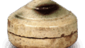 This is a Kizeto ware of a bamboo Hikikiri lid and rest, which were widely used in the tea ceremony at that time. They are presumed to have been fired at the former residence, according to fragments excavated from the kiln site or at the former residence. The glaze is rather thin and the style is quite skillful. A similar green-glazed Oribe ware lid rest was also fired in the same kiln.