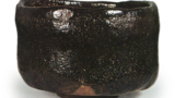 This bowl was probably originally made as a mukozuke (tea bowl), but is now used as a tea bowl. The glaze over the entire surface is soft and burnished in a single layer, and the sides are decorated with a design of plum bowls and irises carved in lines, over which is applied a vitriol glaze. It is somewhat thick and heavy to handle. It was once owned by Mashida Nunoo and is inscribed “Banzai” on it.