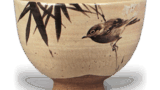 This is a typical Seto black tea bowl, large and strong with little artifice. The body is firmly erect with rough spatula marks, and the beveled spatula is sharp on the warped edge of the bowl. The low, waist-high body is a common characteristic of Seto black tea bowls. The small height of the stand is interesting with spatula marks added, and a spiral-shaped helmet with a width of a spiral is carved out of the stand. A shallow “chadameuri” (tea tamenuri) is placed in the center of the prospect. In addition to the craftsmanship of the shape, this piece has a smooth, melted lacquer-black finish. In addition to the craftsmanship of the shape, the smooth, melted jet-black glaze is beautifully applied over the entire surface, leaving a triangular area of clay around the bottom. The skipping glaze on the side of the base forms a scene.