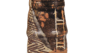 This is one of Oribe’s large and attractive works of art, which also includes a hand bowl. This is a long lidded bowl with four sides and corners, and its body rises deeper and more generously than the usual simmered bowls. In the center of the flat lid is a 16-petaled chrysanthemum flower in relief, which serves as a knob. The body is made one step deeper from the waist to the bottom, and has legs on all four sides of the underside. The body and lid are both covered with green glaze on the opposite sides. The margins of the lid are decorated with a pole with a curling vine, a pine tree, and an abstract pattern of white circles on a black ground. The finish of the ware is rare for Oribe lidded wares, and the glaze is very soft.
