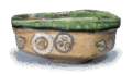 This tea bowl has a soft glazed surface and a vivid pattern. One side of the body has a cloisonne roundel design, while the other side is decorated with a mamidou pattern on the inside, and the mouth is covered with green glaze.