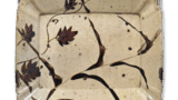 Among the tea caddies that are said to be Oribe’s favorites, there are some tea caddies that have been called “hungry demon belly” since ancient times. This tea caddy has “hungry demon belly” written in Katagiri Ishizhou’s calligraphy on the front of the lid of the inner box. This tea caddy has ears on both sides near the shoulders, and one side of the body is strongly indented. The body is covered with a black glaze with a fine stripe pattern, and a feldspar glaze is applied over the black glaze until near the hem. The bottom of the bowl has an ito-bottom.