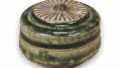 This incense container is shaped like a rice ball and has a low hand on the back of the lid. Both the body and lid are covered with green glaze on one side, and the other side is decorated with sawtooth patterns and horizontal and vertical stripes. The base is extremely low, and the interior is shallowly cut down to reveal a soft clay surface on the bottom. Since ancient times, tea masters have called this type of hand-formed incense container “Hajiki Kouai.