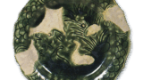 This incense burner has a rounded mouth and a hexagonal body, with ears on both sides and legs on three sides of the flat bottom. The upper part is glazed with green glaze, the body is painted with iron paints with a mamdo pattern, and feldspar glaze is applied from the bottom to the legs. It must have once been accompanied by a lid. The interior shows a white clay skin.