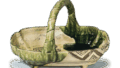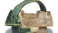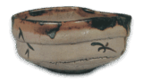 This is a handled bowl of the Shuhama shape with one side straight, with a tortoiseshell and arabesque patterns on the side and a diagonal pattern on the side, both roughly painted. The finish is somewhat rough.