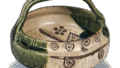 Oribe square bowl with handle across mouth with flower and grass scroll design