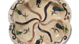 This large hand-bowl has a floral design at the mouth, a carved design on the guard rim and outside, and a chrysanthemum design on the hand. The prospective view is simply decorated with a design of an Ashi-egret.