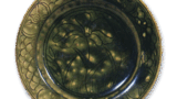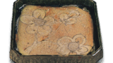 This hand basin has a four-sided deformed shape with a stroked rim, and is decorated with a chrysanthemum-shaped sealed floral motif on the hand and inside, etc., and with a landscape painting on the mouth. It is rare to find a tebachi with a sealed flower pattern all the way down to the surface of the bowl.