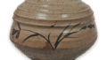 This is a jar in the shape of an arithmetic bowl, which is unique to ekaratsu. The wide mouth is stepped on the inside so that the lid can be dropped over it. The overall shape is gentle and peaceful, and the grass patterns on the two sides of the body are simple and tasteful, harmonizing with the shape of the vessel. The glaze, which was applied to the entire interior and exterior surfaces up to the base of the body, is well melted and browned, creating an unsophisticated scene with large blotches from the mouth to the body. It is probably the work of Koraishin Ichinose.