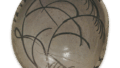 This is an excellent example of a large Karatsu dish that has recently come within the scope of our collection. It is similar to the previous work, but the touch of the pine leaves is somewhat different. The base is quite small, and the shallow whorl-like cutting within the base is unusual. The glazed surface is well melted and finely pierced.