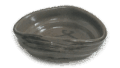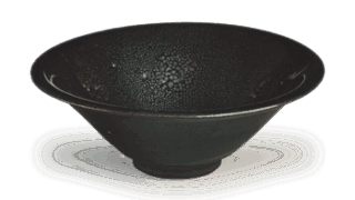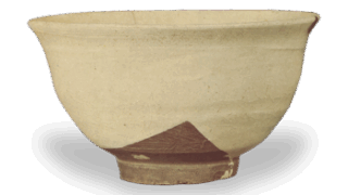 A glazed tea bowl in the shape of a shallow shoe. The black glaze is roughly applied diagonally from the mouth to the inside and outside of the bowl, and the nosho (dried dried dried paper streamer) design is painted on the side of the bowl. The low base has a small interior with a wide tatami mat.