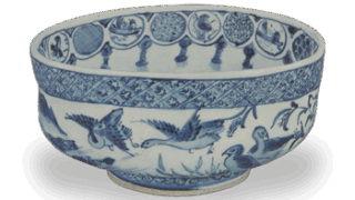 This is a Kutsu-shape tea bowl with a landscape design in the same hand as the Karatsu Kutsu Kutsu Tea Bowl, and is estimated to have been made by the Tani Kiln of the Omiya Pottery.