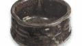 This is a Shokotani black karatsu vessel, also with a pressed and distorted mouth. The waist is rounded, the body is tightened, and the base is carved out low. The feldspar glaze applied over the black glaze is thick, giving the entire surface a serpentine scorpion style. The glazed surface is soft, and it is an excellent work for this type of tea bowl.