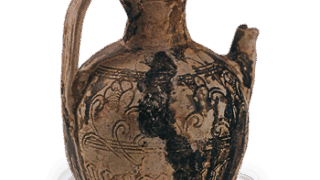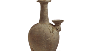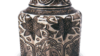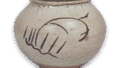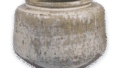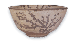 This painted karatsu jar is estimated to have been made at the Hozabashira kiln. The plump and taut body has a simple appearance. The body is covered with a thick layer of feldspar glaze, but the glaze has been stained during the course of its life.
