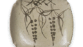 This bowl has an oval open mouth and is picked on all four sides. The design of waterweeds is depicted on the prospective side, and a stripe pattern is drawn around the mouth in a very neat, thin, and elegant manner. The base is thick and thinly carved, and the glaze melts smoothly. It may have been made by the Taku Koraigaya kiln.