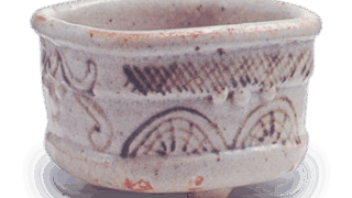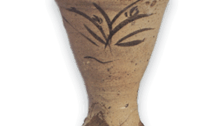 This is a slightly thin wheel-thrown cylindrical vase with the mouth pressed down on three sides to form the shape of Shuhama. The base is firmly cut to be open, which is unique to Uchida Saraya Kiln. One side of the body is decorated with autumn grasses, while the other side is decorated with a graceful vine-like pattern. The glaze has melted well and turned a bluish gray color. Because of its large size, it is currently used as a hibiya.