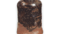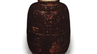 This tea caddy has a shoulder-jointed shape, modeled after Seto tea caddies, and is of neat workmanship. The bottom is raised on a wooden plank and has an “x” mark carved into it and a molded circular pattern. The bottom of the bowl has a black candy glaze all the way to the bottom. The kiln is not clear, but it is probably of the Fuji-no-Kawauchi type.