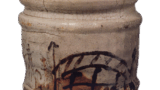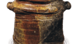 This is a rare example of a Shigemochi-style gourd-shaped container, a style of Shigaraki or Iga ware. The top and bottom of the body are decorated with patterns in the style of kizusa, glauze, and pine needles, while the mouth and one side of the body are glazed in black and the other in feldspar. The flat bottom was also glazed, leaving faint traces of the glaze. Since a similar piece with mottled black glaze was excavated from the Ushi kiln, it is assumed to have been made in the same kiln.